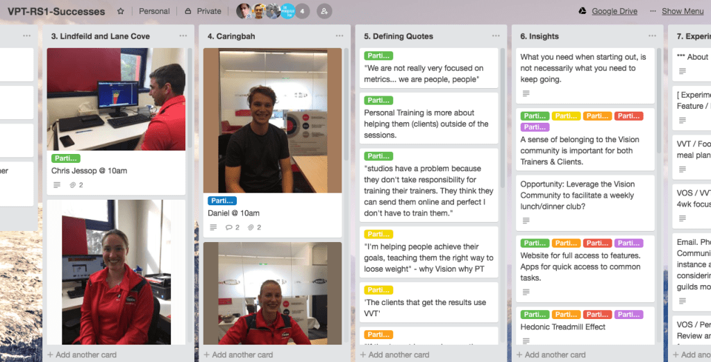 Ways of working: Research was organised into a series of sprints and was conducted on-site at VisionPT’s studios across Greater Sydney. Planning, analysis and presentations were performed remotely, with a heavy reliance on Slack, Trello, and G-Suite to collaborate. Several in-person workshops were also conducted to capture business insights and align stakeholders. Additional telephone interviews were conducted at studios in Melbourne and New Zealand.